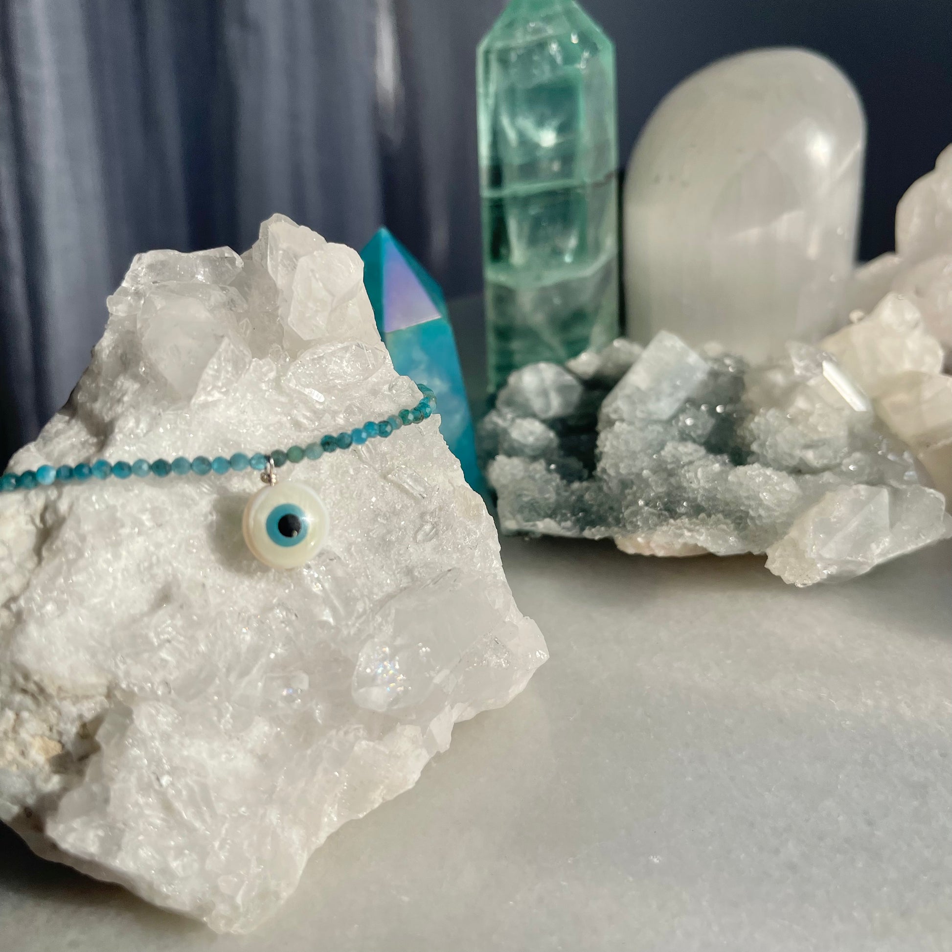 Hand strung beaded necklace. Made of 2mm faceted blue apatite beads with an evil eye focal point. Metal is sterling silver. Great to wear alone or for layering.