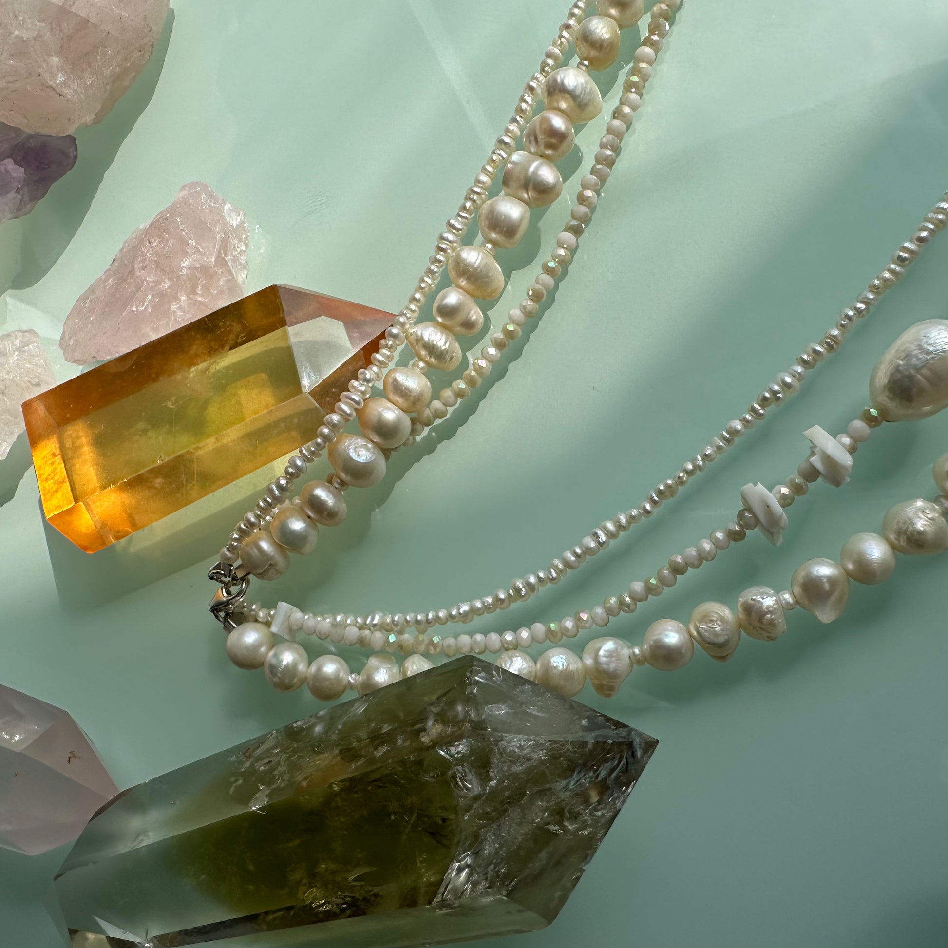 Phoenix Mother of Pearl, Faceted Bead & Pearl Multi-strand Layered Necklace OOAK
