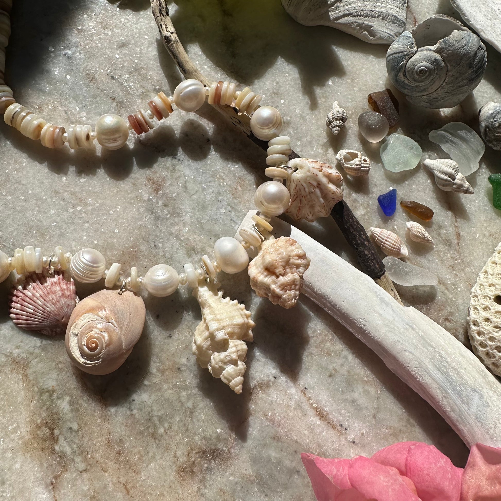 Mixed hand-drilled seashells with mixed pearls and shell beads. Sterling silver hardware. One of a kind / OOAK